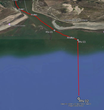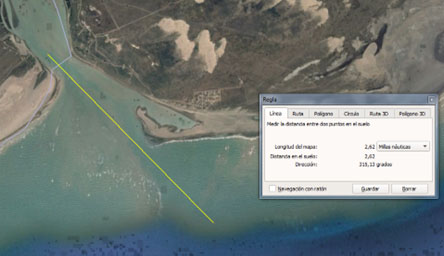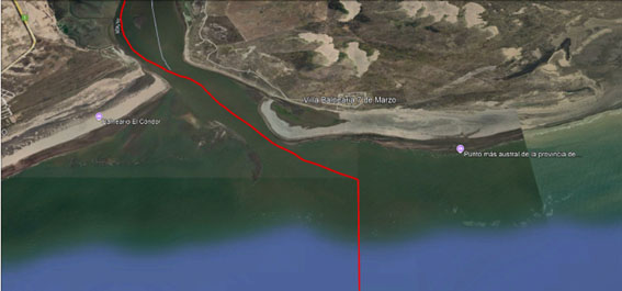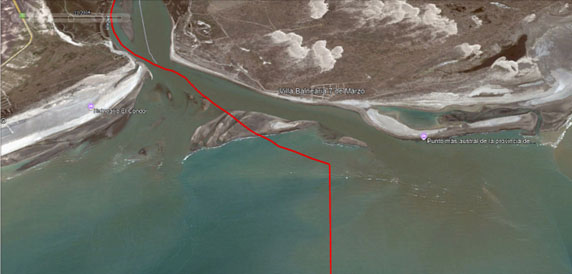 Nuestra estimación de 4,5 nudos no fue exacta, anduvimos más ligero y tardamos menos de las 36 horas prevista. Llegamos antes y estuvimos dando unas vueltas por la costa del Balneario El Cóndor. Cuando faltaban 2 horas para la pleamar, pusimos el rumbo que nos había sugerido Javier.