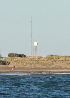 Allá en la costa de la Provincia de Buenos Aires veíamos un tanque de agua y una antena, que nos indicaban (aproximadamente) hacia dónde teníamos que dirigirnos (Rv = 000°). Entramos en el canal marcando la ecosonda un mínimo de 3,40 m de profundidad. El Azul cala 2,00 metros.