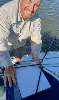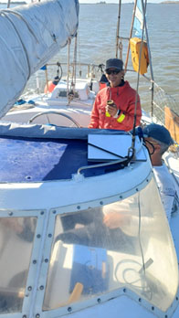 El día de la zarpada se apareció mi amigo David con un paquete debajo del brazo. Debí sospecharlo. Ya me había negado anteriormente, pero ahora se complotó con Gustavo, y de prepo me lo hicieron llevar. Me molestan los cables sueltos (bah, todo lo que anda suelto y no está en su lugar), pero Gustavo le encontró un lugar a la antena, sobre la chubasquera, y los cables quedaron bastante prolijos. También me querían embarcar un drone. Ahí si que no acepté.