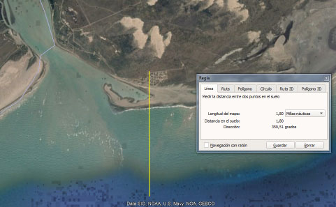 Situarse para entrar con Rv 000º, alineándose con la Villa 7 de Marzo hasta llegar a la profundidad de 3 m. en baja, a 0.5 mn de la costa aproximadamente.