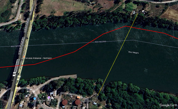 Cuando estamos llegando al puente ferrocarretero, vamos a ver una línea de alta tensión que atraviesa el río (línea amarilla). No ofrece dificultades, pero por las dudas conviene pasar pegado a la costa de Patagones, donde tenemos más altura libre (track en rojo).