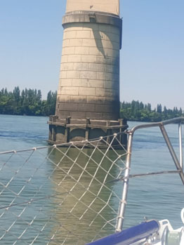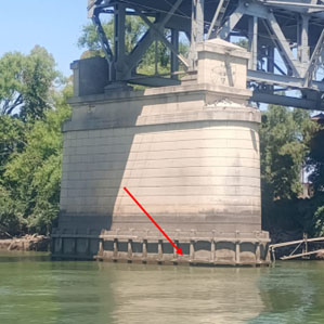 Los pilares tienen dos filas horizontales de maderas para protección. Si se ve la fila de abajo, tendremos 17 metros de luz bajo el puente. Eso no garantiza que se pueda pasar, ya que hay varios cables que cuelgan entre pilares. Uno de esos cables tocamos con nuestra antena al entrar.
